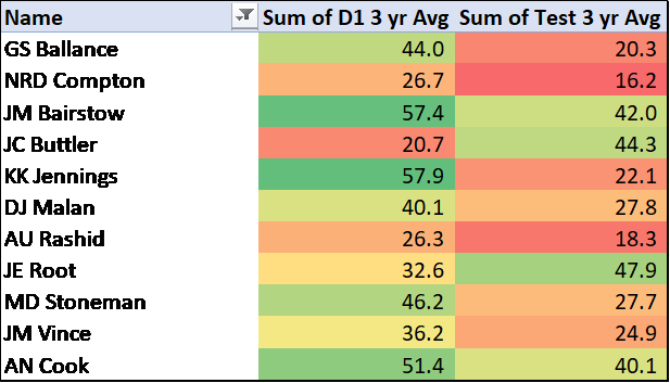 • I have used relative performance for English players with >4 completed innings in each format, and weighted the overall result according to the lower of the completed innings in each format. For instance, Ben Stokes has played 8 completed D1 innings, but 46 Test innings – so the overall result is weighted with a factor of 8 because of Stokes’ performances, while Dawid Malan played 36 D1, 26 Test innings, so is more useful for this exercise and receives a weighting of 26.