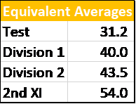 If a player averages 40 in Division 1 – the data says you could expect him to average 31 in Test cricket, 44 in Division 2, and 54 in the 2nd XI.