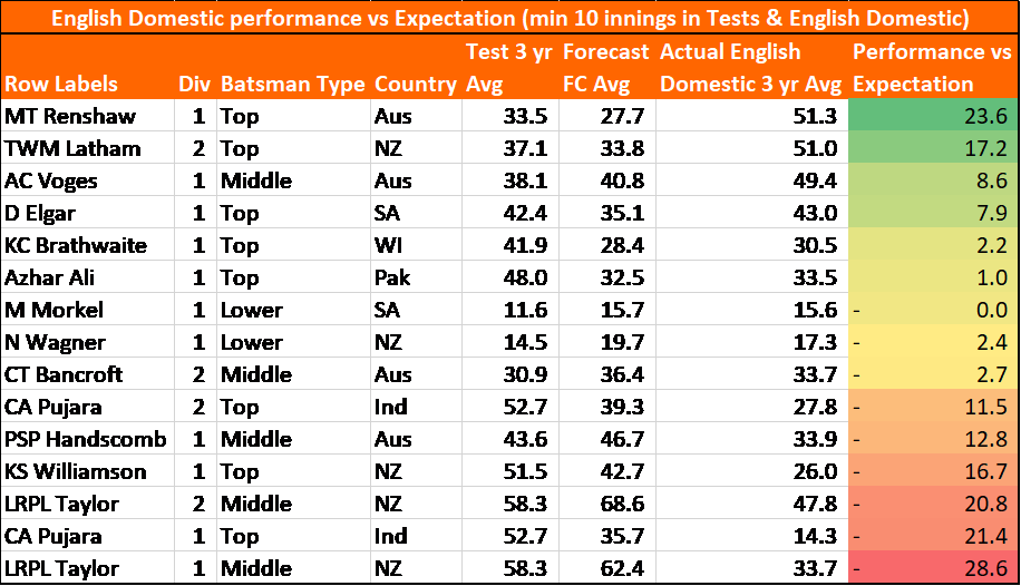 Looking at overseas players, surprisingly they perform 21% worse in Division 1 than their Test average. Contrast that with England players who do 28% better. Two examples jump out: Pujara scoring 172 runs at 14, Kane Williamson scoring 260 runs at 26. How can we explain those scores?