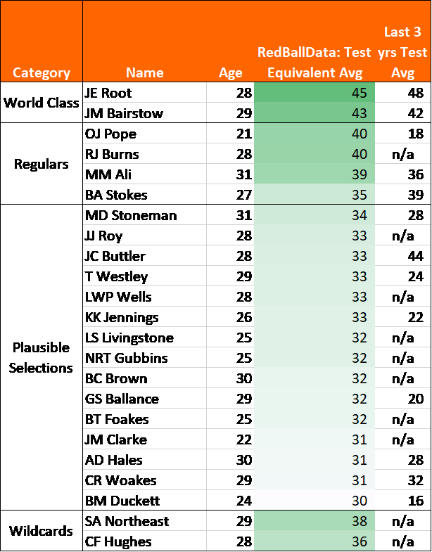 Plausible Selections (Expected Average 30-35) – Stoneman, Roy, Buttler, Westley, Wells, Jennings, Livingstone, Gubbins, Brown, Ballance, Foakes, Clarke, Hales, Denly, Woakes, Duckett.