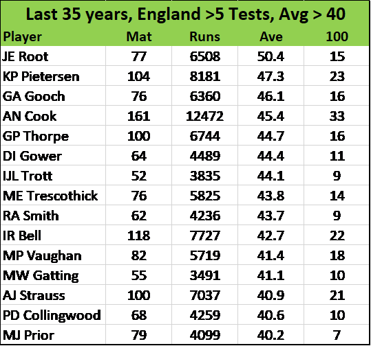In the last 35 years England have had just 15 batsmen who averaged more than 40 over their career. Expectations should shift: aspire to players averaging 40; accept batsmen averaging 35.
