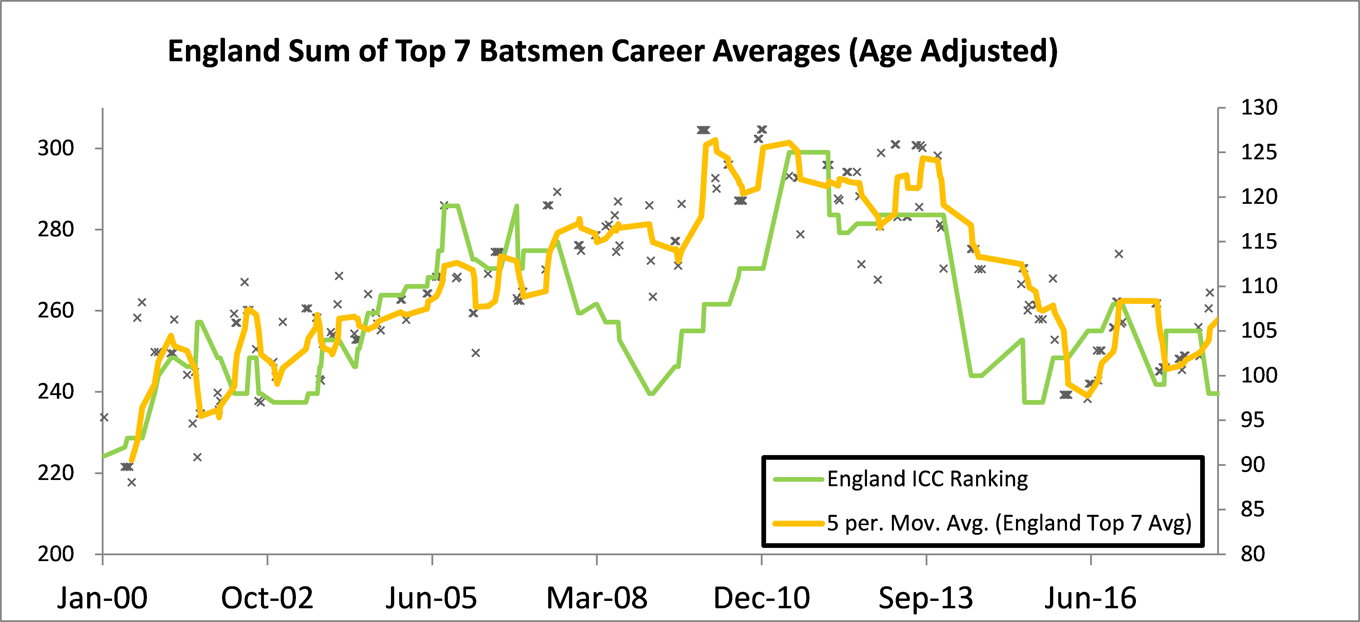To check this model (age adjusted batting average) against reality, I compared this to the ICC rankings. The correlation is clear. Worth noting that since the Age adjusted Batting Average is smoothed using a 5 point moving average, there is a time lag in the orange curve. This correlation is surprising as the ability of the top 7 batsmen makes up less than half of the strength of a team (the remainder being bowling ability and tail batting strength).