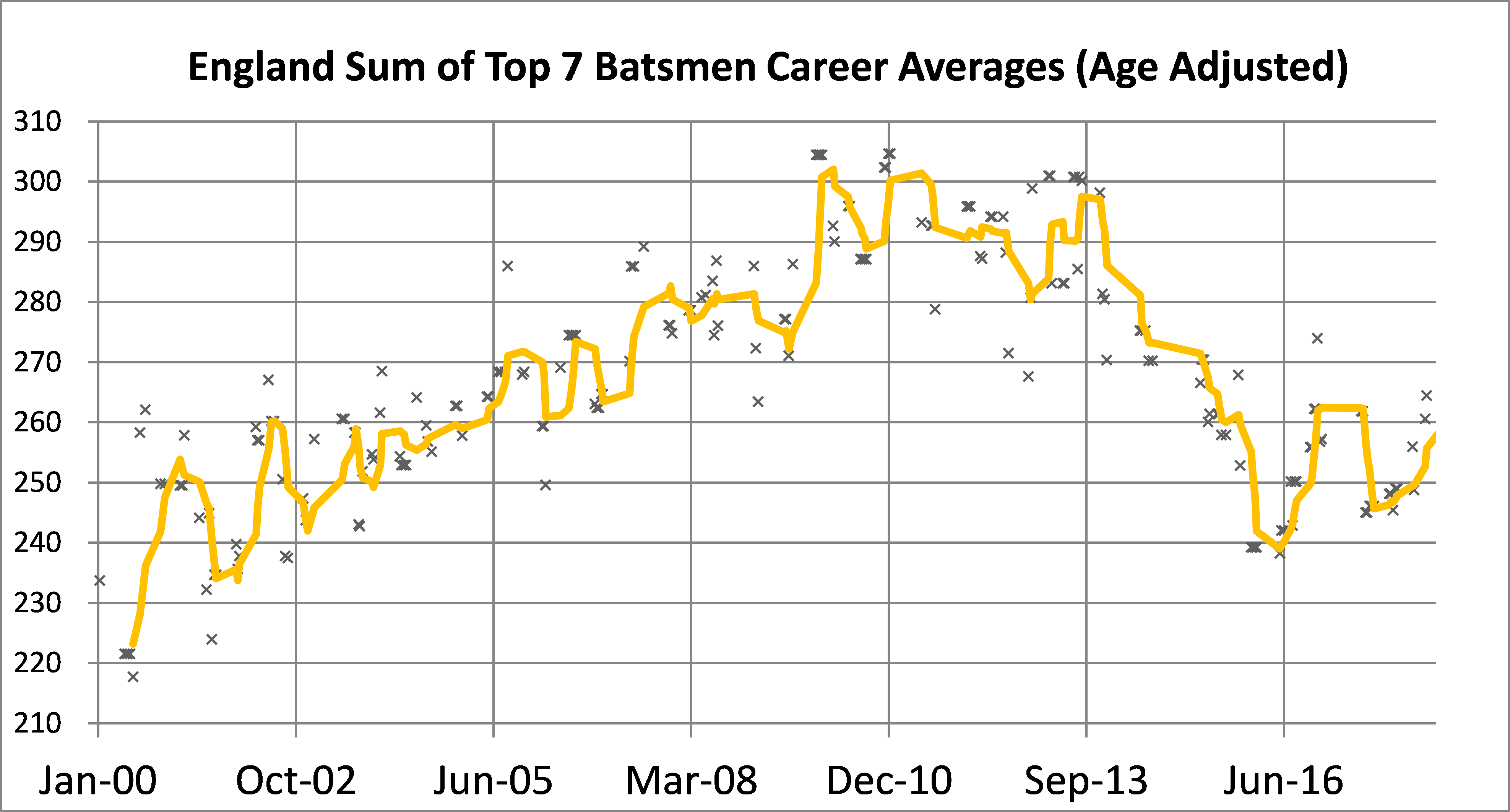 I took the career averages of the top 7 batsmen for each England Test since 2000, and adjusted them for the age of the batsmen (I’ll cover how I do that in a later post). To eliminate artificially low results, Nightwatchmen are excluded. Where someone only played a few Tests, I made a judgement about what their long term average would have been had they played more Tests.