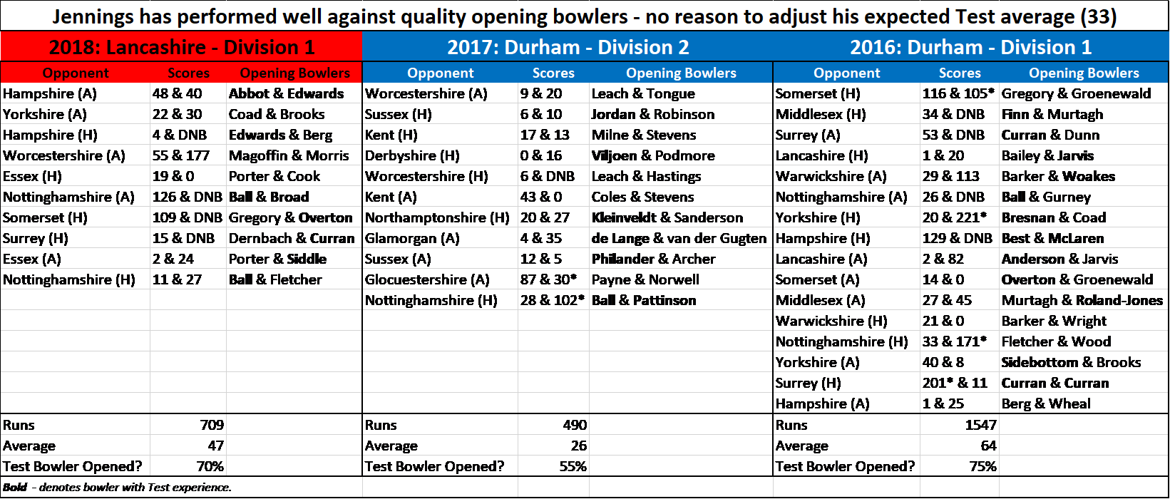 I’ve had a look at his performances over the last 3 years on the county circuit. The hypothesis is that there are some very good pace bowlers in County Cricket, and as an opener Jennings will face them (a middle order batsman might be able to make hay without facing much of the best bowlers).