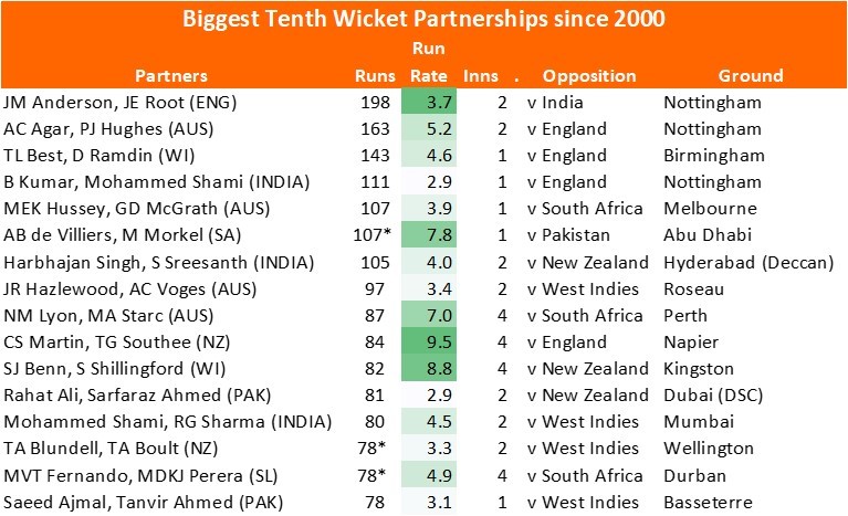 Considering tenth wicket partnerships since 2000, the Mean score is 14.5 runs, the Median eight, and the mean duration is 25 balls. The chance of scoring 78 or more is roughly 100-1. [1]