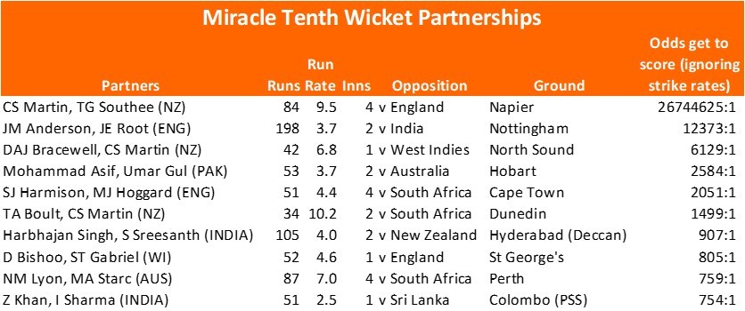 Ignore Strike Rate and the 84 Chris Martin put on with Tim Southee in 2008 (link) was a one-in-27 million event. Adjust for bludgeoning Southee and circumspect Martin and that drops to 1,500-1.