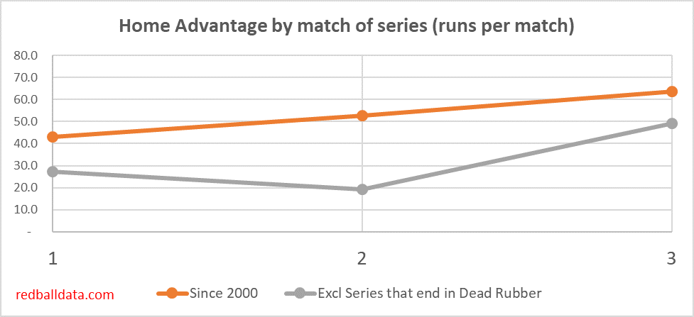 Excluding one-sided series shows lower home advantage (because it excludes big home wins when a visiting team can’t compete with a superior host team). The overall effect is the same though- home advantage gets markedly bigger in the later Tests.