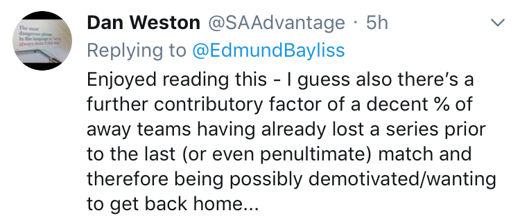 Dan Weston (@SAAdvantage) suggested that matches after the series had already been decided could be a factor that hadn’t been taken into account: