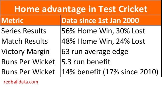 The key metric is the 14% difference in runs per wicket between home and away teams. All other effects are a consequence of that. Take a player with a theoretical average of 35 – at home he’ll average 37.4; away that drops to 32.6. Over the course of an average match the 17% difference translates to a 63 run total edge to the home team, which in turn means roughly twice as many home wins as away wins in matches & series.