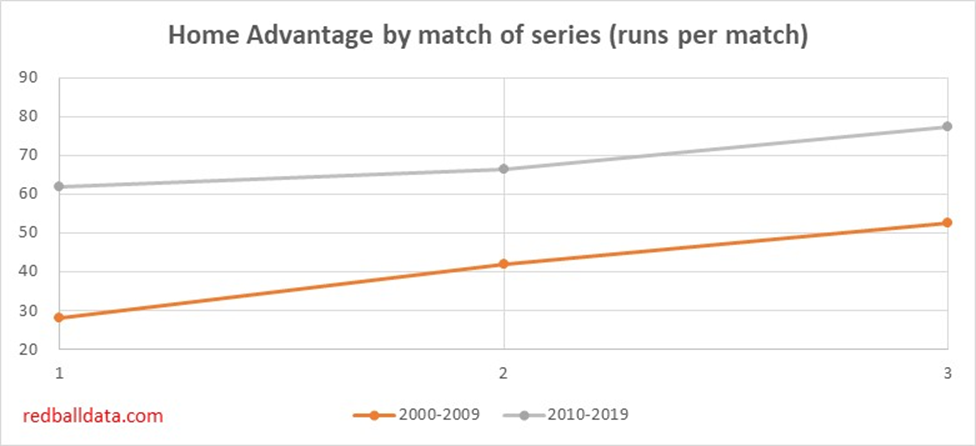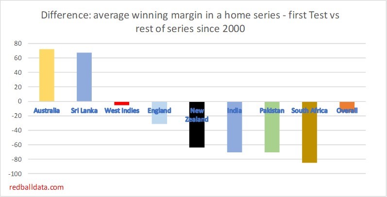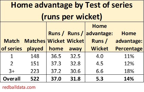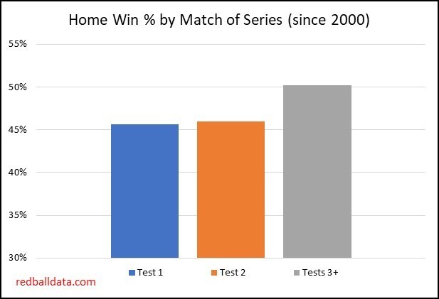 Generally, home advantage is actually weaker in the first Test than later matches. But note the ‘Gabba effect in Australia – this traditional series opener is especially suited to players with experience in Australian conditions. That’s the exception – in most cases, home teams have more success later in the series.