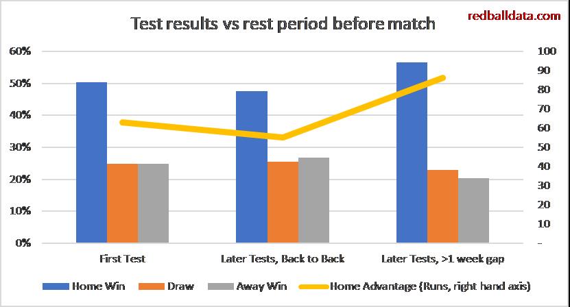 There’s a certain base advantage in the first Test of a series, which is kept at the same level if subsequent Tests are played back-to-back (ie with less than a seven day gap between matches). Away teams are at a much bigger disadvantage when there is a longer gap between Tests.