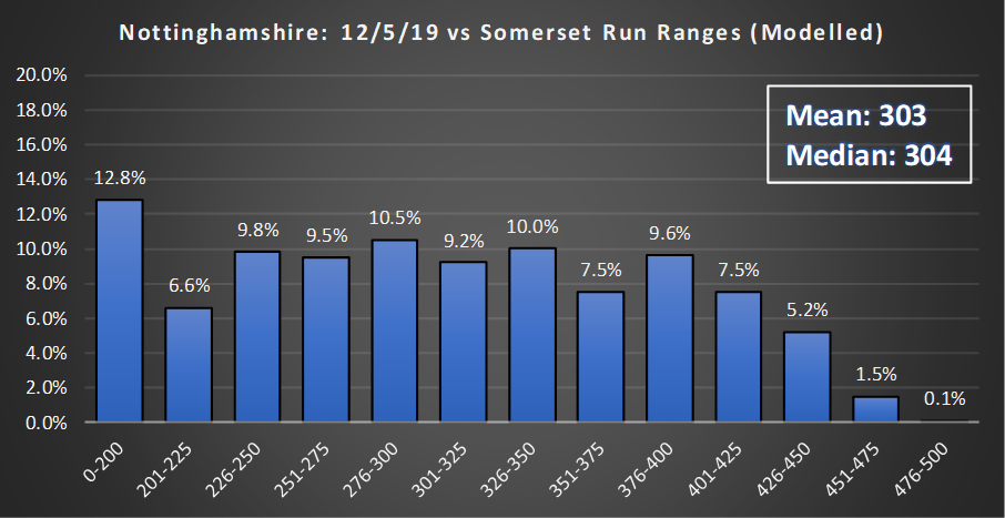 This makes for a rather unusual range of first innings scores if Notts bat first. Remember that Trent Bridge is a high scoring ground.