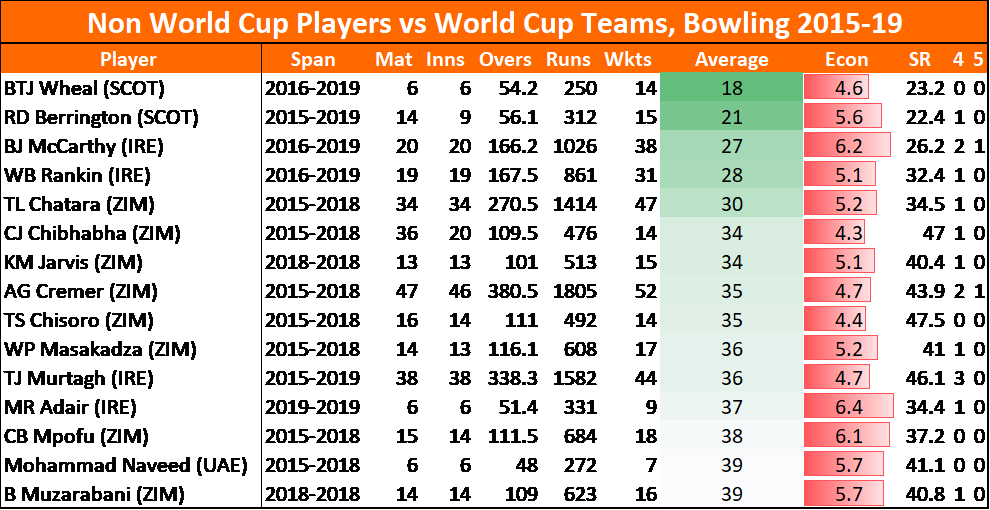 As for bowling, not many great averages, but these Economy rates would keep the NWC XI in the game. As for individual countries, Zimbabwe have plenty of bowling which could challenge the top ODI teams. Ireland and Scotland don’t have that depth.