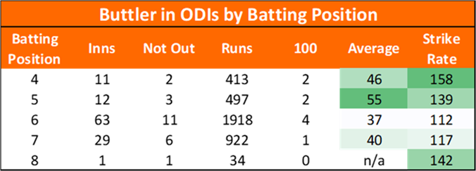 The more excitable among us would conclude that six is Buttler’s weakest position, and he has to bat at four or five based on the above averages and strike rates. Personally (and somewhat arbitrarily), I’d like a 20 innings sample size before concluding. All the table above says is there’s no compelling reason why Buttler can’t bat anywhere in the middle order.