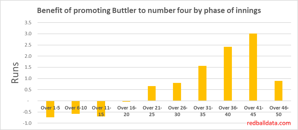 The Duckworth-Lewis method tells us that the way batsmen play at each stage in the innings is a function of how many wickets have fallen. The hypothesis is that the earlier the second wicket falls, the more conservatively England will bat, and thus the less useful it is to promote Buttler. It would actually be counterproductive, because if he’s out he’s not around to score quickly at the end of the innings.