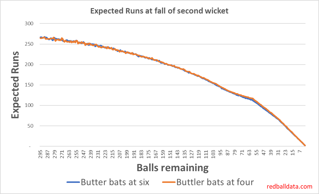 The two curves are very similar. If your eyes (and/or phone resolution) are up to it, you’ll see that the blue line (Buttler in at six) underperforms the orange line, especially in the latter stages of the innings.