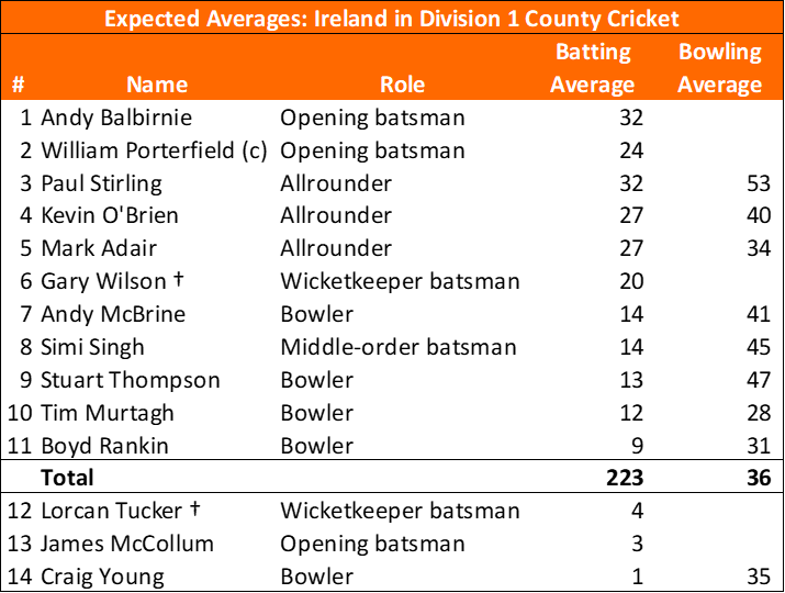 How to appraise the Irish players who don’t have a Test track record yet? Will try two methods, and clumsily fuse them together to give a sense of how this Test might go. Firstly, there have been plenty of ODIs between Ireland and the World Cup teams. Secondly, most of the Irish players have some County experience. Many players have only played a handful of ODIs against the best teams, or county matches, so will take a weighted average of the two formats.
