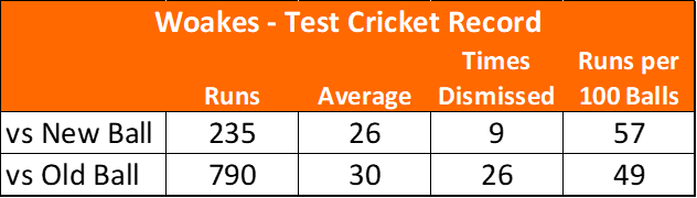 No – While I can’t see any record of Woakes opening the batting, we can see performances against the second new ball. Not a bad proxy for performance at the top of the innings. Soon I’ll build a County Championship ball by ball database, for now his Test record will have to suffice: