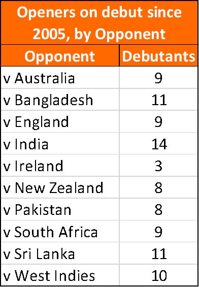 The 96 openers to make their debut since 2005 scored at an average of 32. That is poor when compared to the average for all openers (36). However, that’s not the right comparative. Weaker players will play fewer Tests, so debutants are of lower ability than the average Test player.