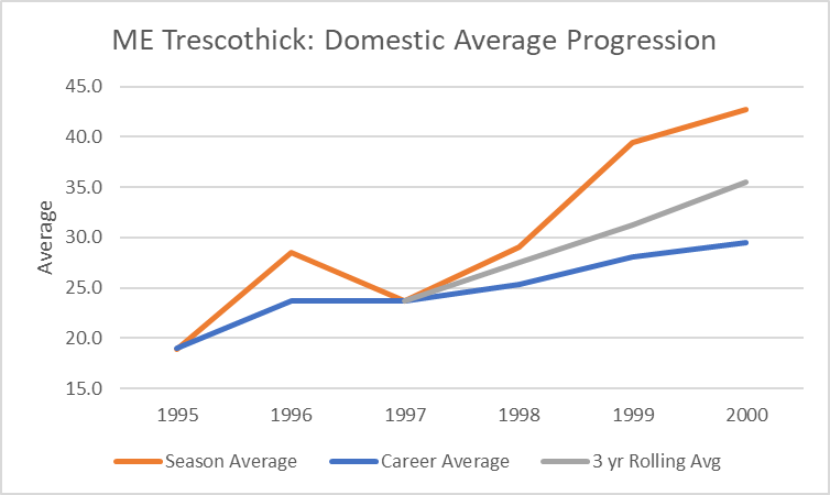 Career averages are misleading: Trescothick played County Cricket aged 20; his career average was dented by playing while so young.