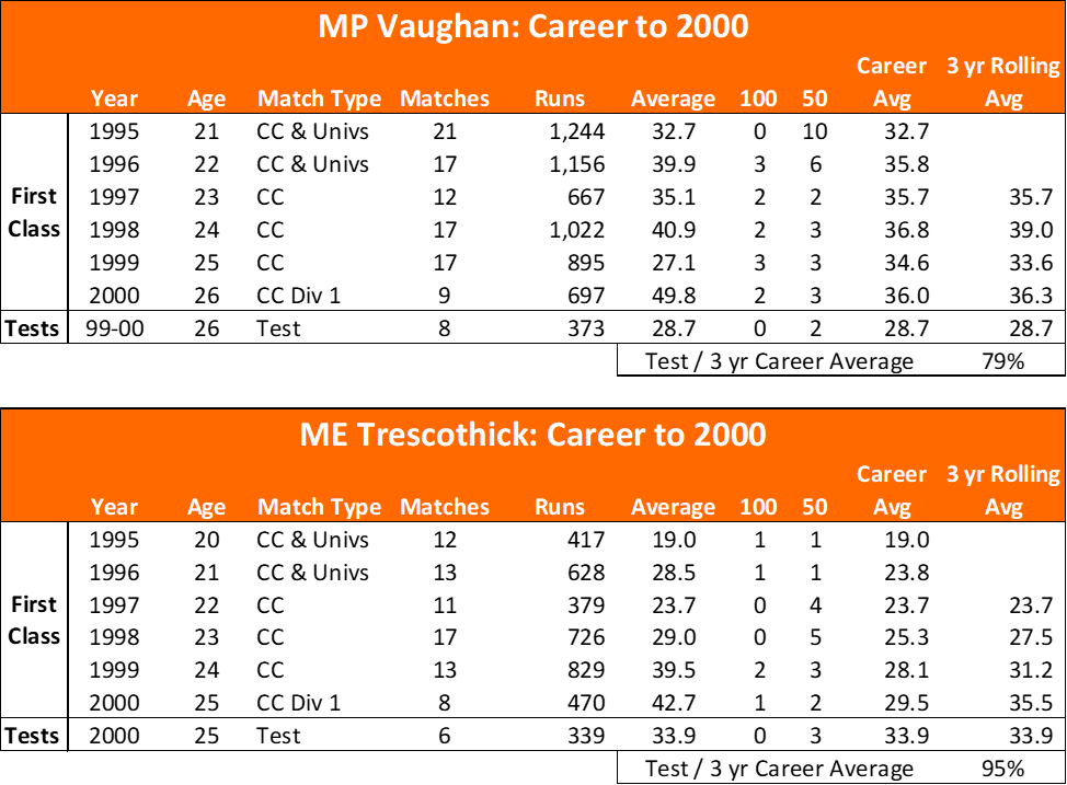 Vaughan and Trescothick had modest career records before their Test debuts. But there was plenty to indicate they had become some of the best English batsmen by the time they were selected (three year domestic averages of 36), and that if they followed normal career trajectories they could thrive in Tests.