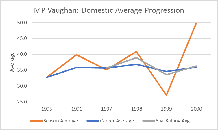 In the perennial debate “Selection: Art or Science”, one of Art’s arguments is that Michael Vaughan and Marcus Trescothick had Modest Records* before succeeding in Test Cricket. In this piece, I’ll demonstrate that there was nothing in their early international careers that couldn’t have been predicted by the right data. They had solid data behind them: we should distinguish between career stats and someone’s more meaningful recent record.