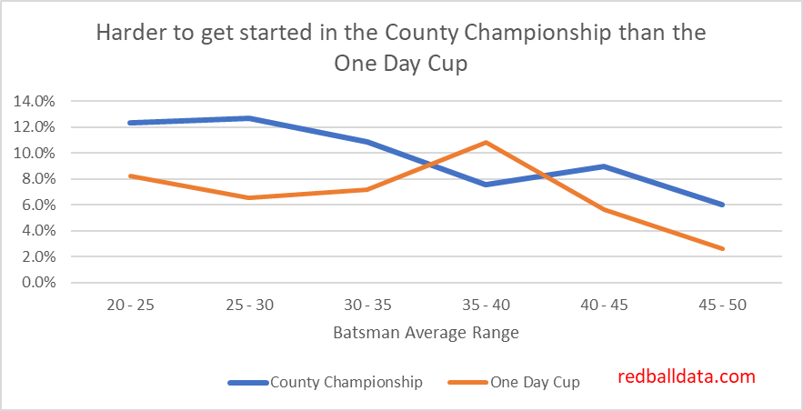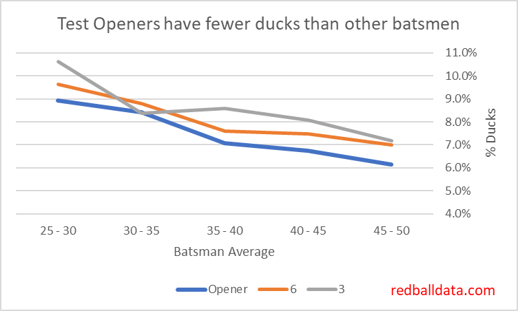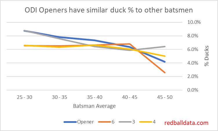 There’s an apparent contradiction here: in limited overs Cricket there is pressure to score from ball one, which should carry more risk – yet it’s easier to get off the mark in ODIs than in Tests. For batsmen averaging 35-40, in ODIs 6.8% of innings are ducks, while for Tests 7.5% of innings are ducks – a 10% greater frequency.