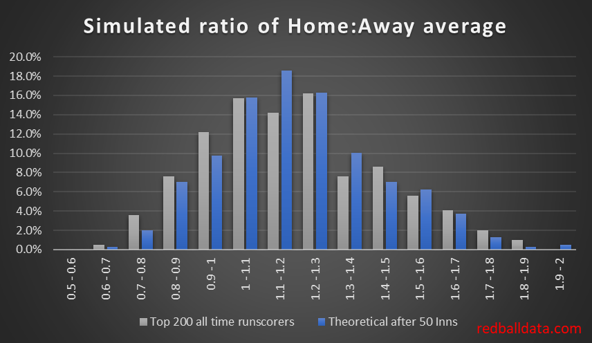Fig 3 – Actual Home:Away Average Ratios for the top 200 runscorers in Test cricket, compared with a simulation of 50 innings at home and 50 away.