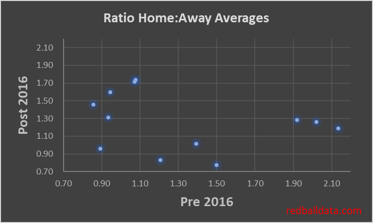 Fig 2 – Home to Away average ratios batting in Test Cricket. Split before and after 31st December 2016. Min 10 completed innings Home and Away pre 31/12/16, min 20 completed innings Home and Away post 31/12/16.