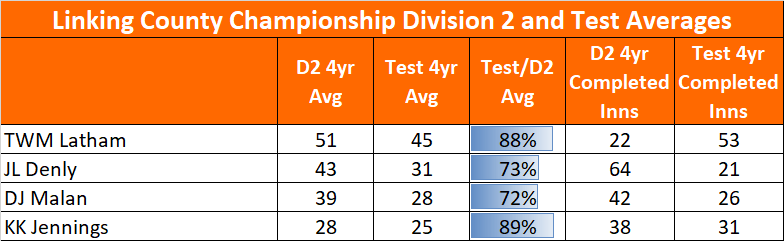 Previous workings showed that a played would expect to average 72% as much in Tests as they do in Division 2 (D2). There isn’t that much data though: most Test players are drawn from the top division. Just four players have over 20 completed innings at both levels over the last four years: