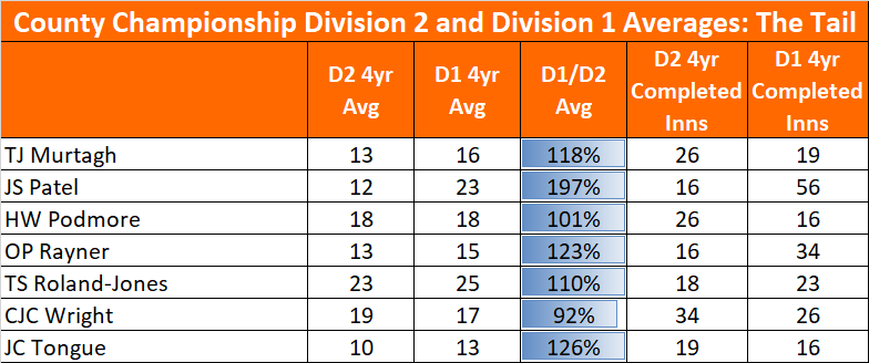 The above chart is for all batsmen that have >15 completed innings in D1 and D2. If anything the trend is for higher averages in D1. Can’t explain that, but at least that gives some comfort that the tail isn’t getting an easier ride in the lower division.