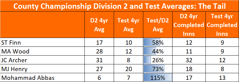Remember none of these players has 20 completed innings in both formats, so expect volatility. Archer and Mohammad Abbas are the outliers: Archer averaged nearly four times as much in D2, while Abbas has a slightly higher Test average.