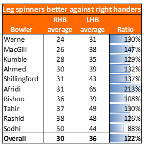 What does the data show? At the highest level of Test Cricket, nine of the ten leg spin bowlers sampled favour right handers. Expect a leggie to average 22% more against left handers in Tests.