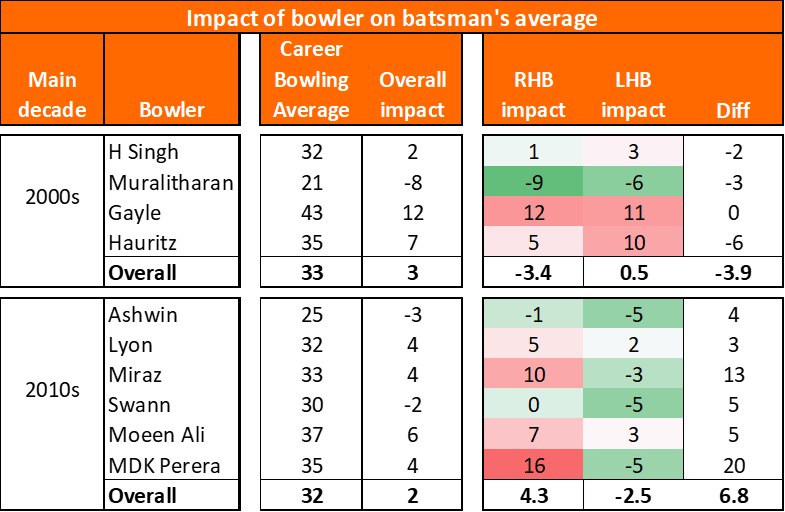 However, that benefit reversed last decade. The hunter has become the hunted. Swann and Ashwin didn’t adversely affect right handers’ averages, but lopped five runs per innings from left handers.