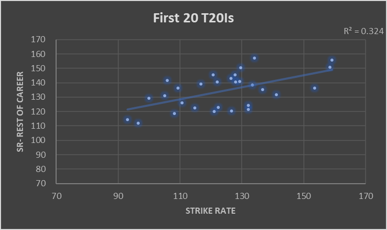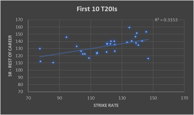 Play for long enough and a batsman’s Strike Rate reflects their ability. However, in the early stages their career Strike Rate will be volatile as the sample is small. One significant factor is the impact of average on Strike Rate: most innings accelerate as they go on, so one big score early on will give a player a temporarily favourable career SR.