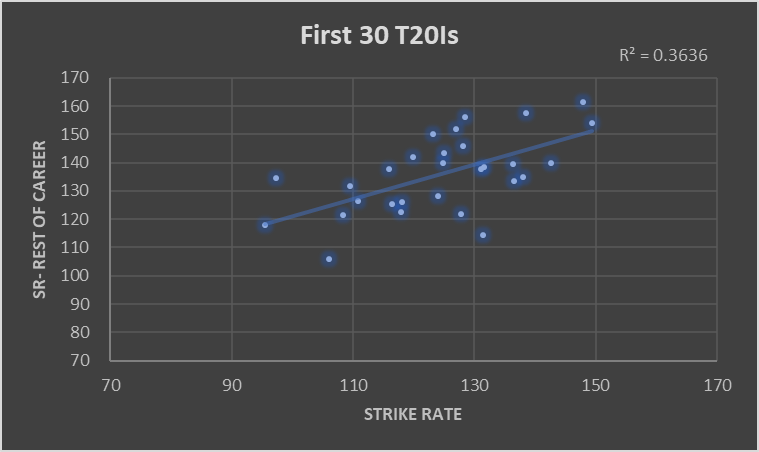 Consider the players who had a SR of 130 in their first 30 innings: one (Dilshan) stuttered and struck at 114 afterwards. Another (Nabi) scored at 156 per hundred balls in subsequent T20Is. If you have a player that has scored at eight an over in their first 30 innings, you may only know that they’ll score at between seven and nine per over from then on. Not very insightful.