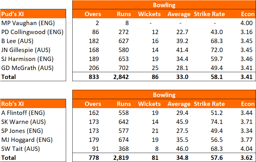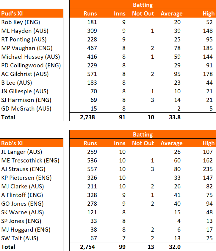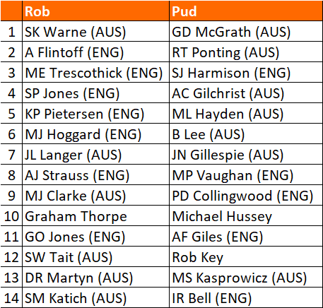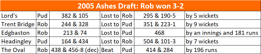 What would happen if the 2005 Ashes series started with a draft? I ran this scenario as a way to test my upgraded Test match model. By enlisting outsiders to draft the teams, they were then eagle-eyed in reviewing the results (thanks to Rob and Pud for their contribution).