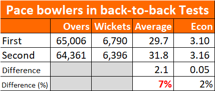 What did I find? Pace bowlers in the second of a pair of back to back Tests average 7% more than in the first game.