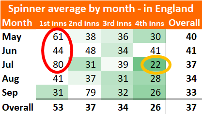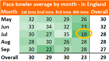 Spin bowlers average 15% less in August/September than May/June. While spinners are generally more effective in the fourth innings, it’s July when they are matchwinners. Averaging 22, with 49 wickets (so a decent sample size). Next consider the same view but for pace bowlers: