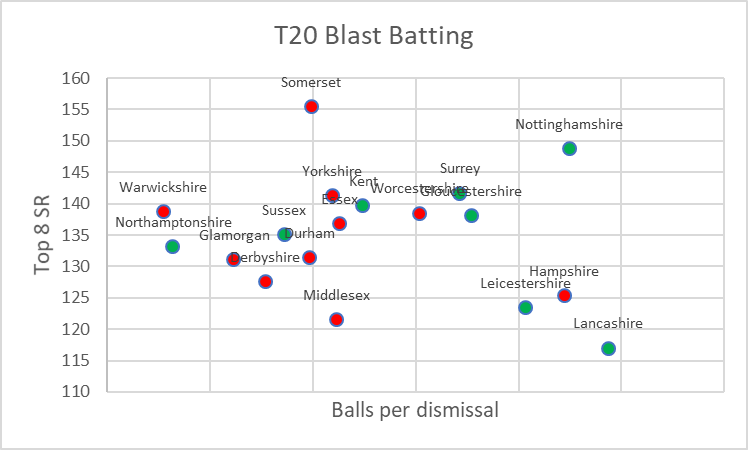 Surrey and Gloucestershire score just as quickly as Yorkshire and Kent, but with higher balls per wicket they are less likely to fail – so are more consistent and better batting units.