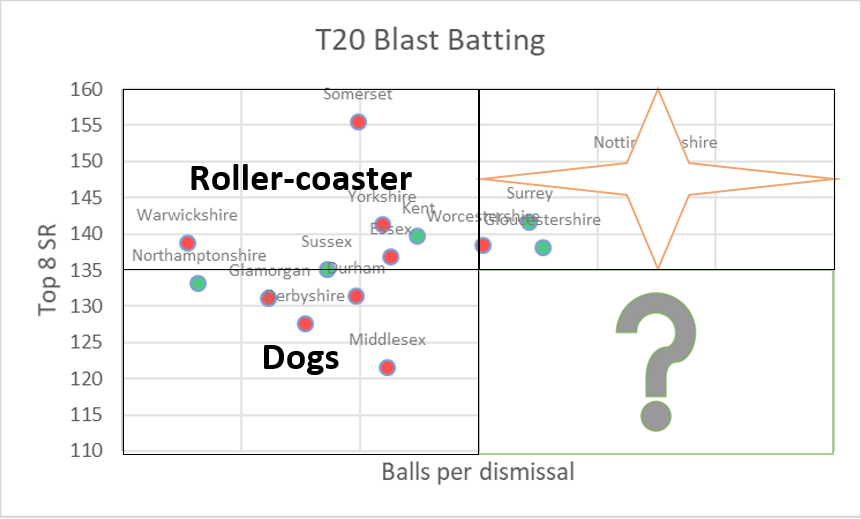 Here’s my attempt at a Boston Consulting Group** view of T20 team batting: