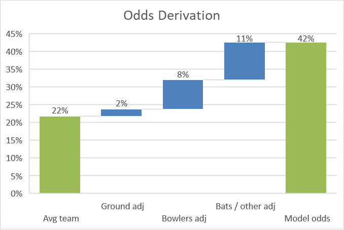 My model had Australia at a 42% chance – the extra 10% coming from the strength of Australian batting, the two batsmen being set, and any other differences between my model’s Monte Carlo simulation and Jonas’ formula. The right hand column is the output of my model, and the penultimate column is the one that goes haywire if something is wrong: a useful check.