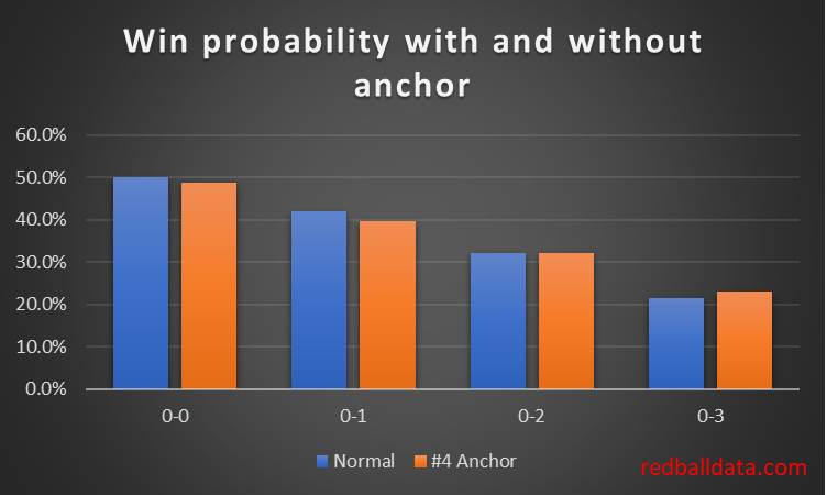 Here’s one example – consider a binary choice where number four in the first innings can either bat normally or anchor (Strike Rate down 10%, Average 20% higher). According to my model, for this current England T20 team, pre innings or at 0-1 anchoring is not optimal. 0-2 it’s marginal. It’s only worthwhile if you’ve slumped to 0-3. Which, coincidentally, is the point at which England’s expected balls drops below 120 (ie. they run the risk of the median innings not lasting 20 overs). This makes intuitive sense: tailor your batting aggression so you almost (but not quite) get bowled out.