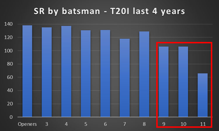But this is too simplistic. Not everyone can strike at 150: you can’t expect fireworks from every tail. Here’s the strike rates of the top 10 T20I teams over the last five years. Numbers 9-11 just aren’t as good. I think of teams “Running out of steam” when all the quick scorers are out.**