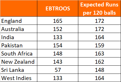 Looking at this another way, on average it takes more than 120 balls to bowl a team out. The openers can go out and play naturally, expecting the top seven to do the business. The number eight batsman averages only three balls per game. I think of limited overs batting in terms of “Expected Balls”: how long would you expect it to take to bowl this team out if they were batting normally? For example, England bat deep, expecting to last 172 balls before being bowled out – this gives them licence to attack in a game that’s only 120 balls long.