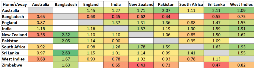 Actual RPW ratios 2000-2020. For example, Australia outscored England by 45% when at home, while England were outscored by 13% when hosting Australia. Minimum 50 wickets – blanks reflect a lack of data.