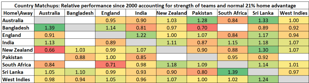 We should adjust for the relative strength of teams: Bangladesh have lost all four games in England this century – but is that purely because of the gulf in talent? If Bangladesh were as good as England, how much would they lose expect to lose by because they were playing in English conditions?