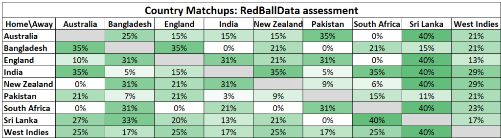 Home advantage (%) for specific pairs of teams – after adjustments made by me. For example, Australia get a 25% boost hosting Bangladesh