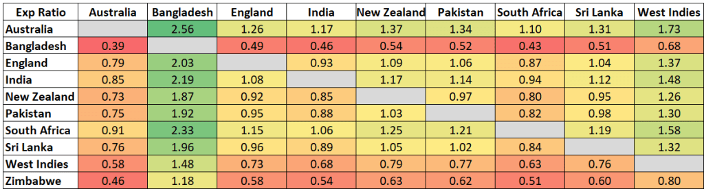 See where we’re going with this? Now all we need to do is compare actual relative runs per wicket when the countries play each other to get specific country vs country matchups.