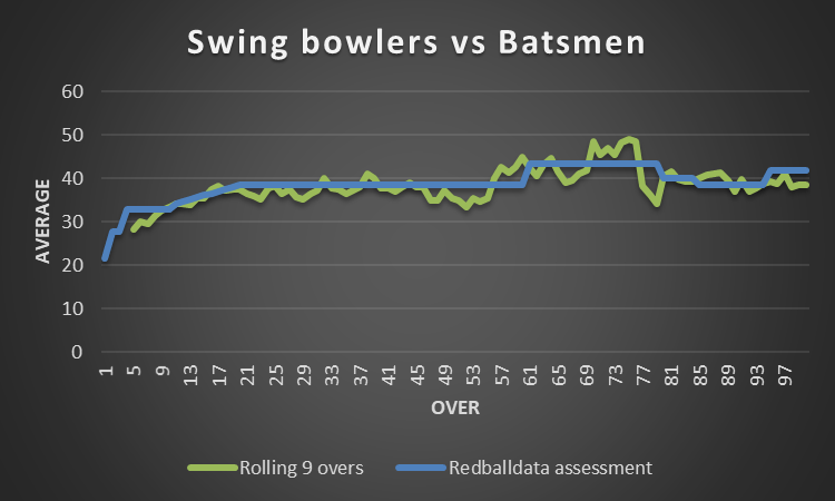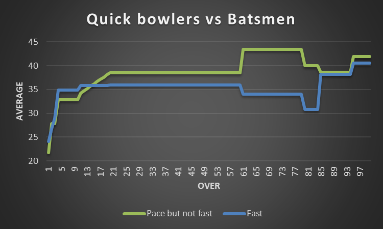 What about pace (not fast) bowlers? Contrastingly, they are deadly with a brand new ball, dangerous until the 20th over, but then rather ineffective – especially overs 60-80.